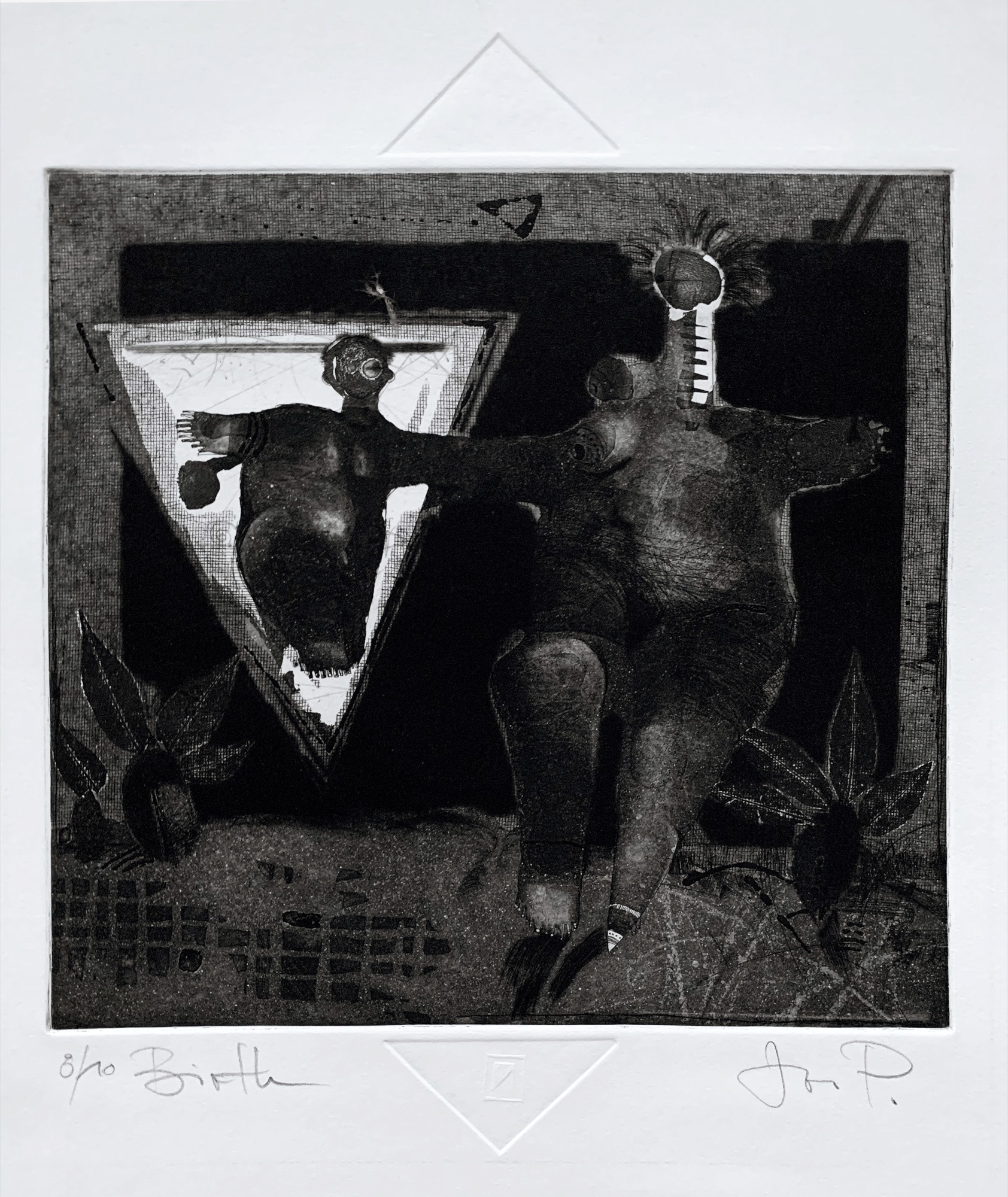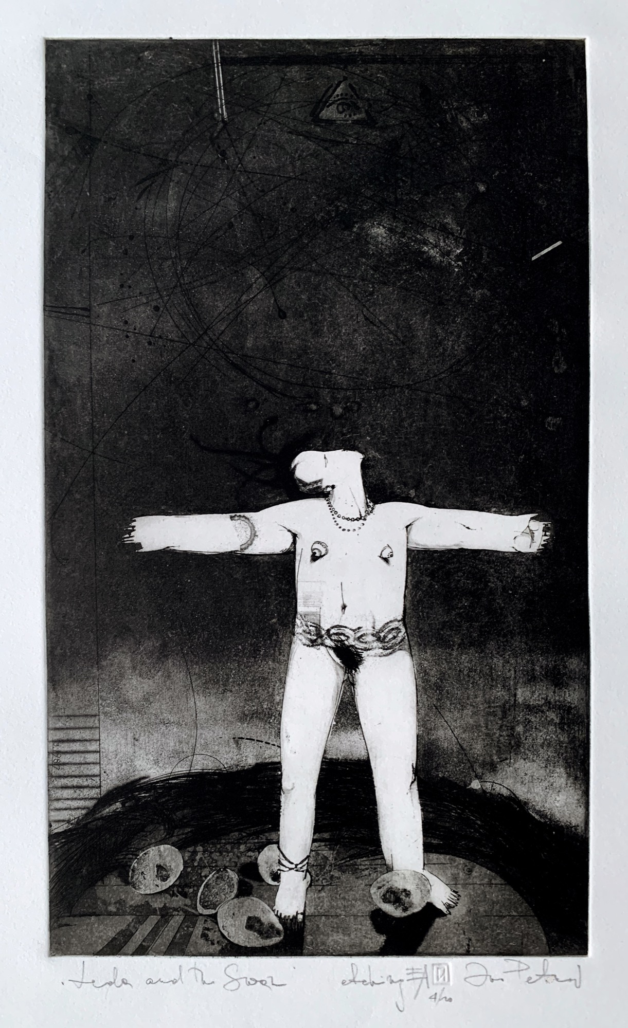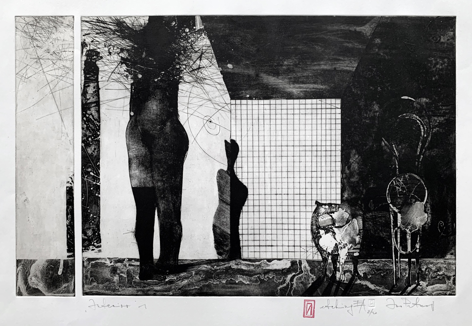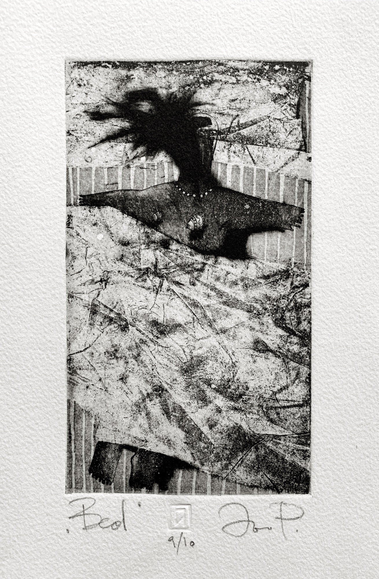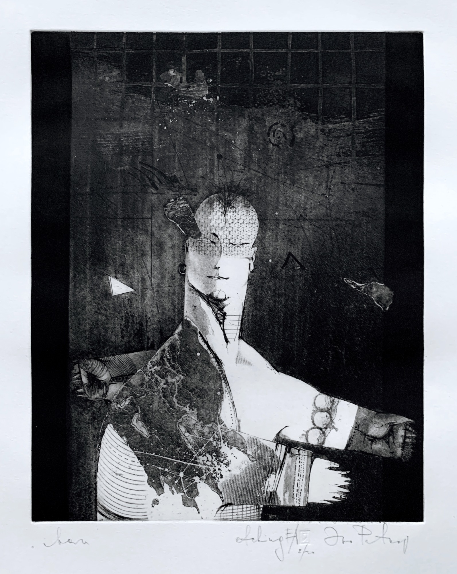 This is only a small portion of Ivo's prints, predominantly from the period 1985-88. The main medium is intaglio on copper. While working with AIC Fine Arts in Los Angles, CA, the gallery owner William Ward III initiated producing a series of 18 ca gold plated print plates, essentially cancelled at the final print, to be framed with the last of the edition as a collector's item. All artworks are in very limited editions of 10. During the tumultuous years after the fall of the Berlin Wall, some of the original plates were lost from Ivo's studio in Sofia. All copper plates, produced at the printmaking facility of the School of Arts, Washington University in Saint Louis, MO, were essentially put through the gold plating cancellation process and framed accordingly. Some of them were also hand-colored with auqarelle and feature an artist auto-glyph below the main image.