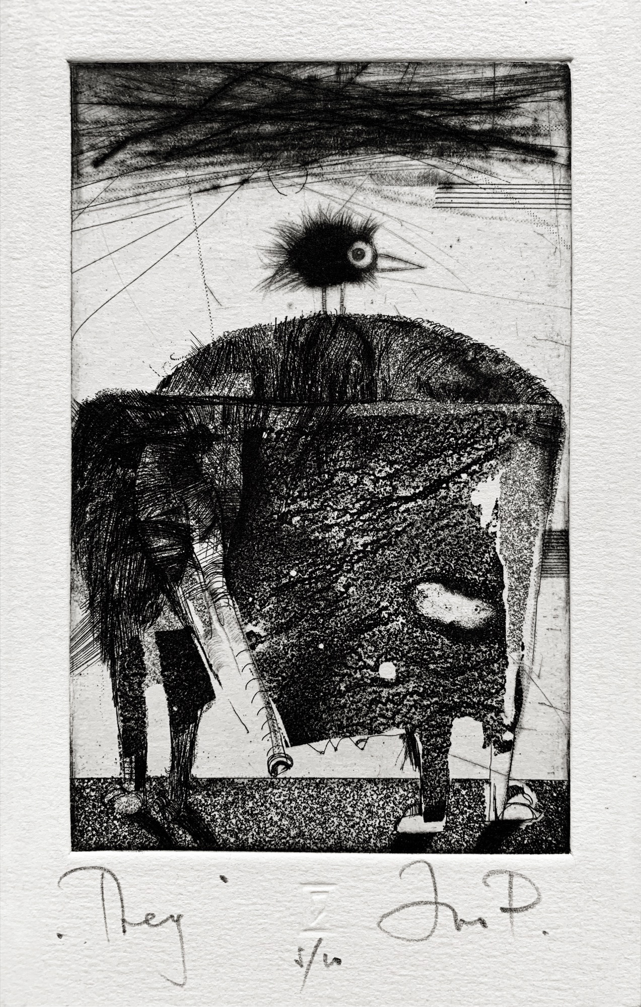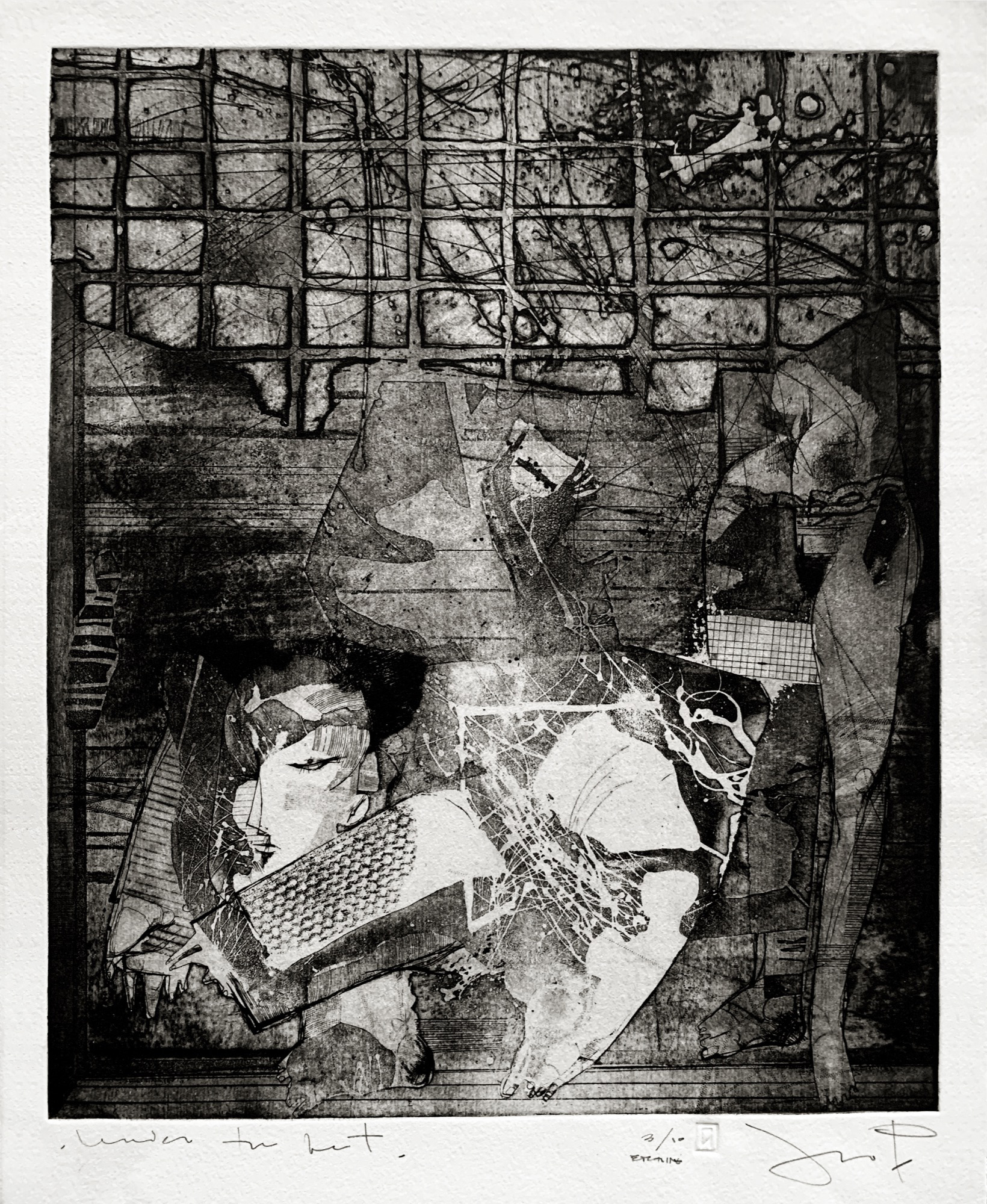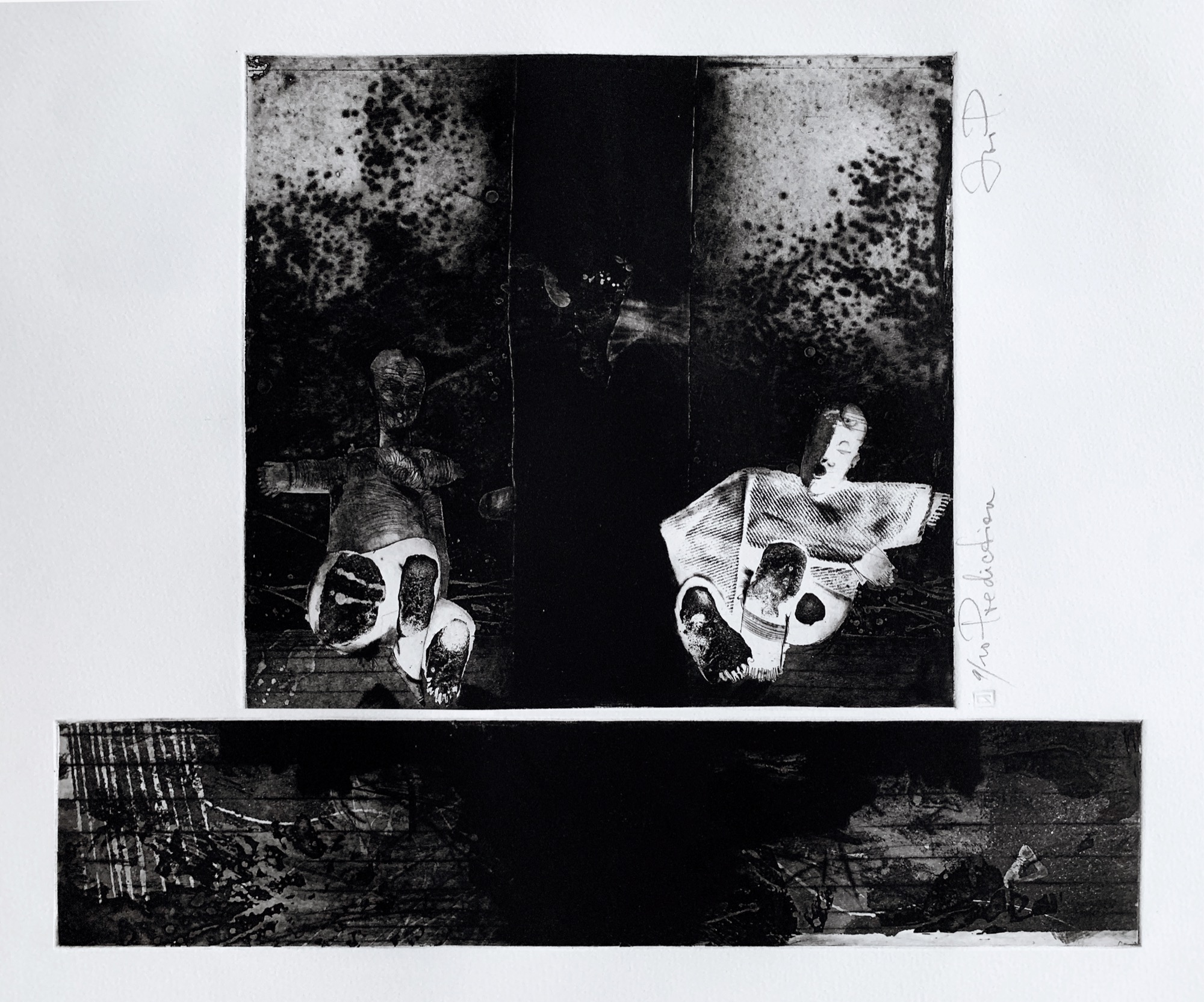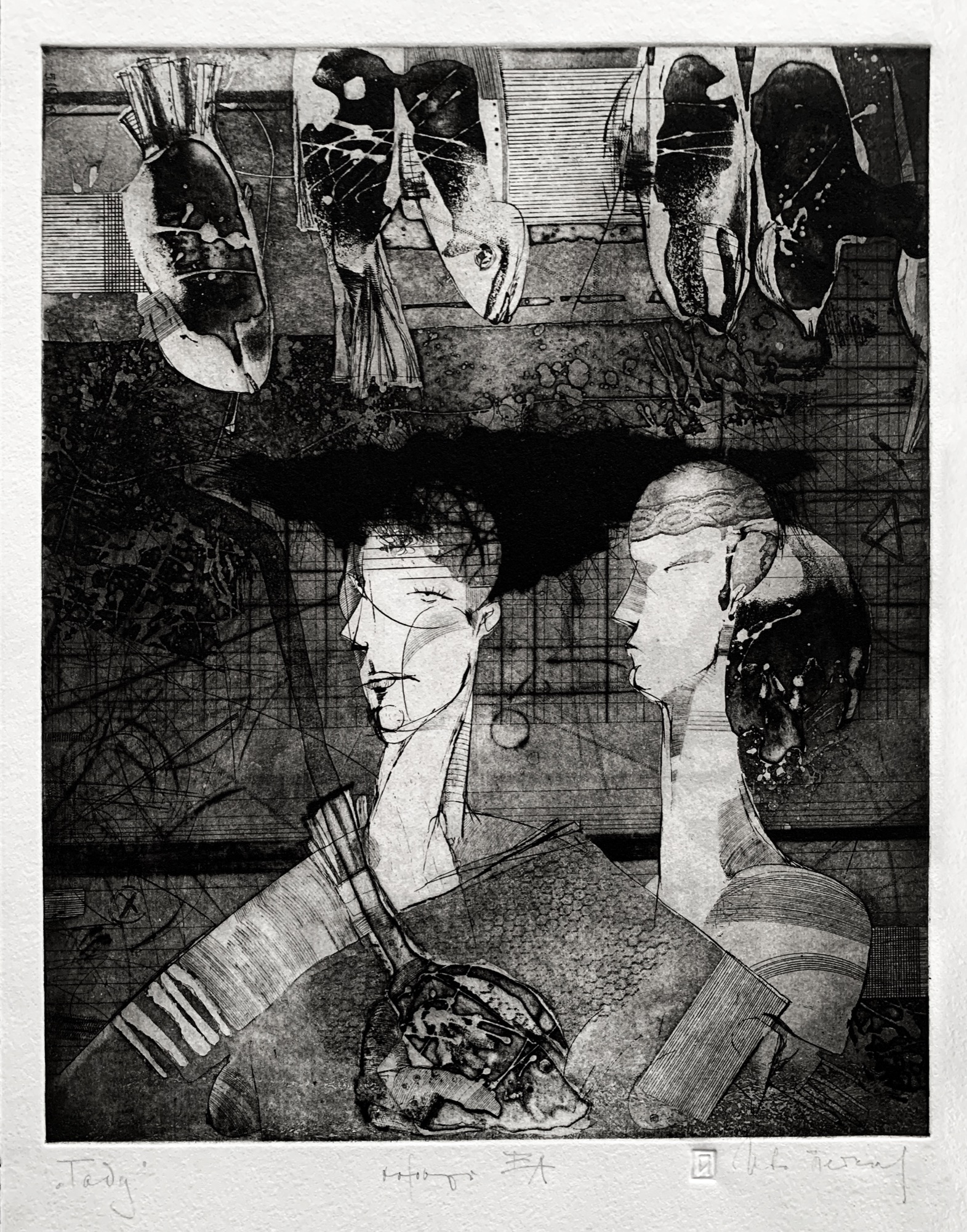 This is only a small portion of Ivo's prints, predominantly from the period 1985-88. The main medium is intaglio on copper. While working with AIC Fine Arts in Los Angles, CA, the gallery owner William Ward III initiated producing a series of 18 ca gold plated print plates, essentially cancelled at the final print, to be framed with the last of the edition as a collector's item. All artworks are in very limited editions of 10. During the tumultuous years after the fall of the Berlin Wall, some of the original plates were lost from Ivo's studio in Sofia. All copper plates, produced at the printmaking facility of the School of Arts, Washington University in Saint Louis, MO, were essentially put through the gold plating cancellation process and framed accordingly. Some of them were also hand-colored with auqarelle and feature an artist auto-glyph below the main image.