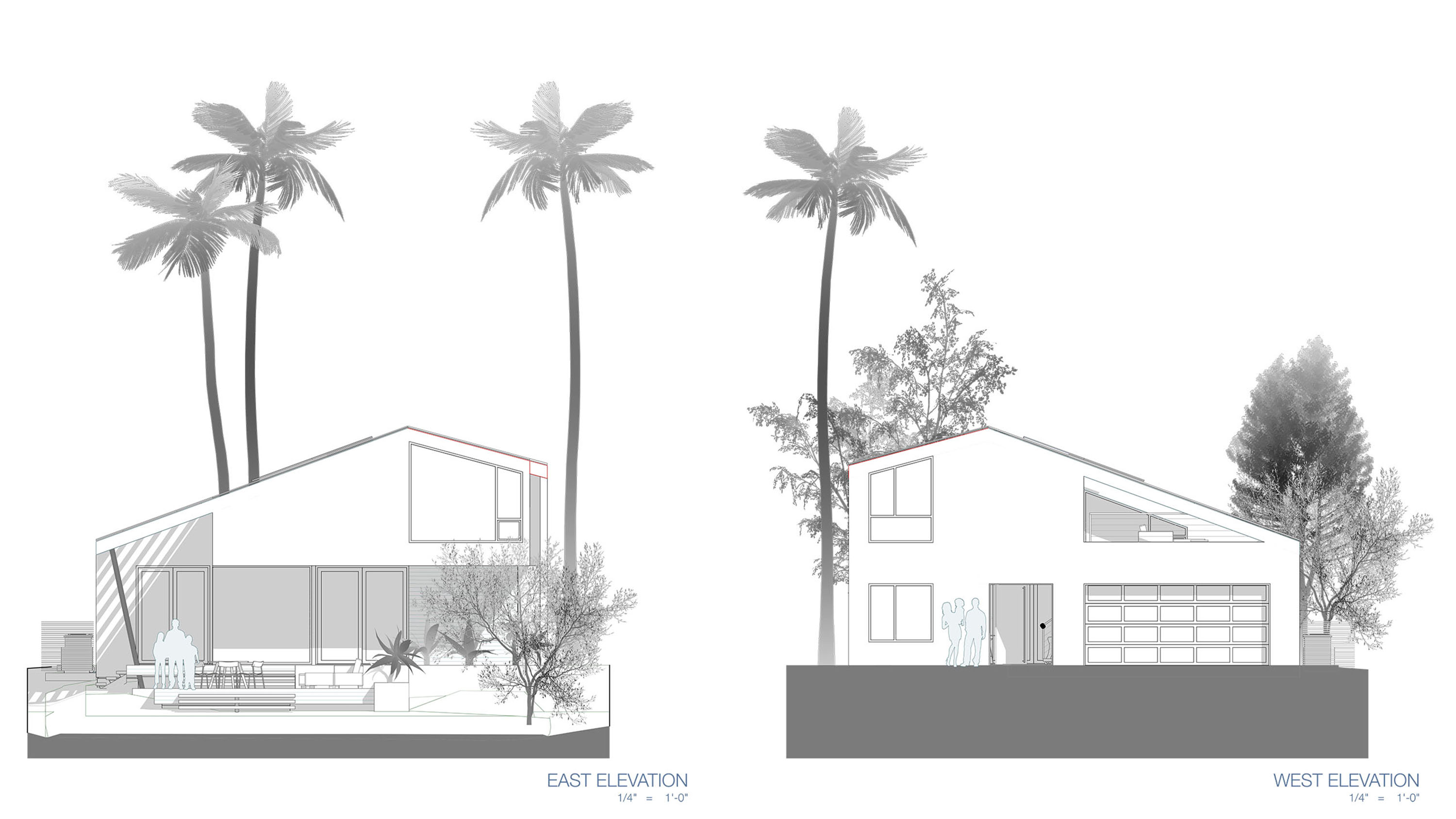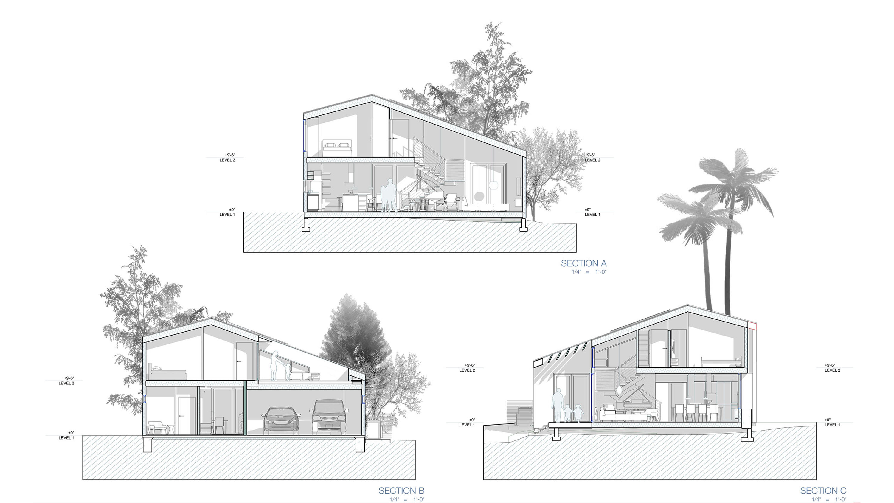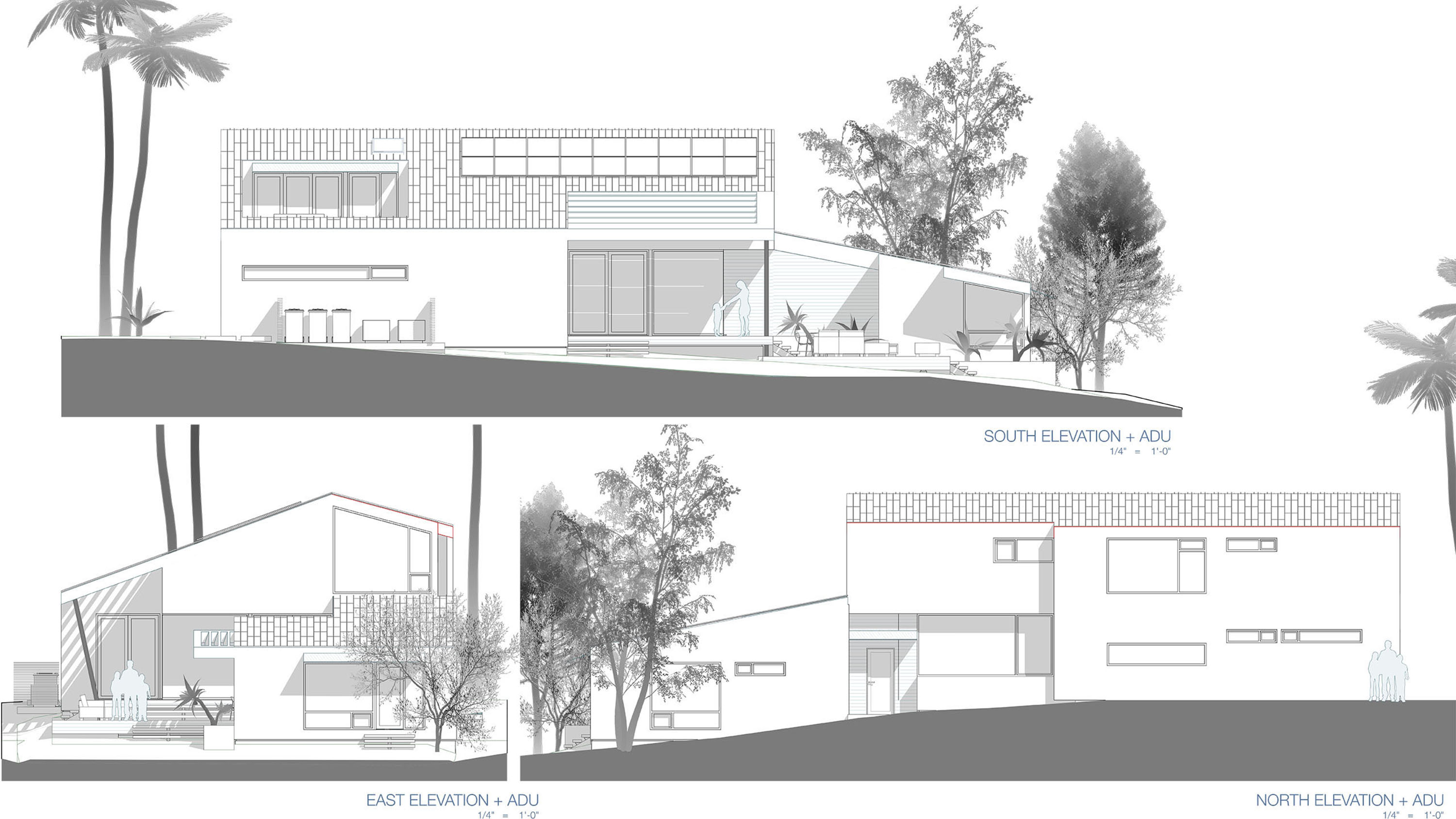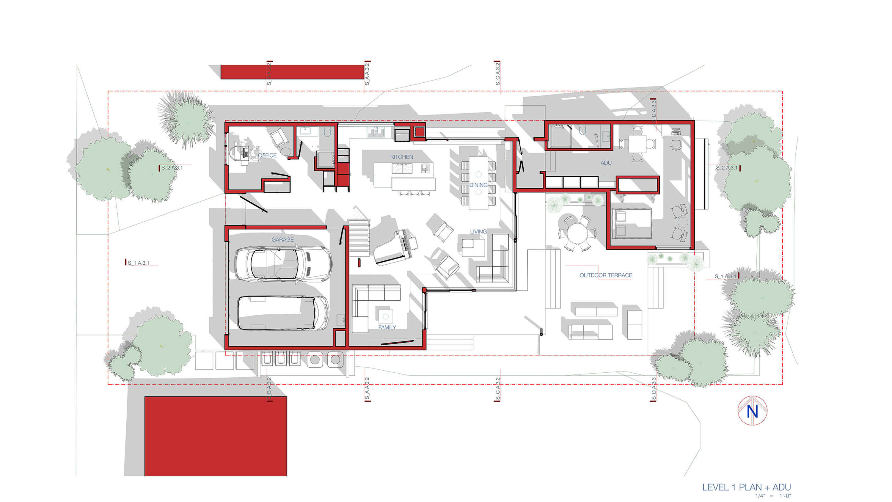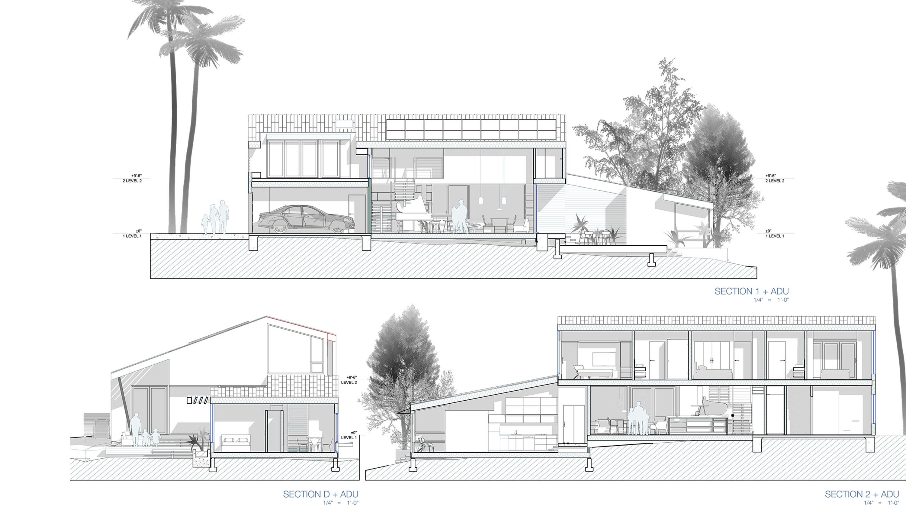 Amidst the urban setting, a tranquil garden offers a serene escape, connecting the home to nature. The rooftop deck over the garage provides panoramic views and a unique outdoor space for relaxation and entertainment. An optional ADU, part of another permit, adds to the home’s versatility and addresses California’s call for diversity and extended city planning needs. The small unit, fully autonomous, could be used as a rental or a guest suite.