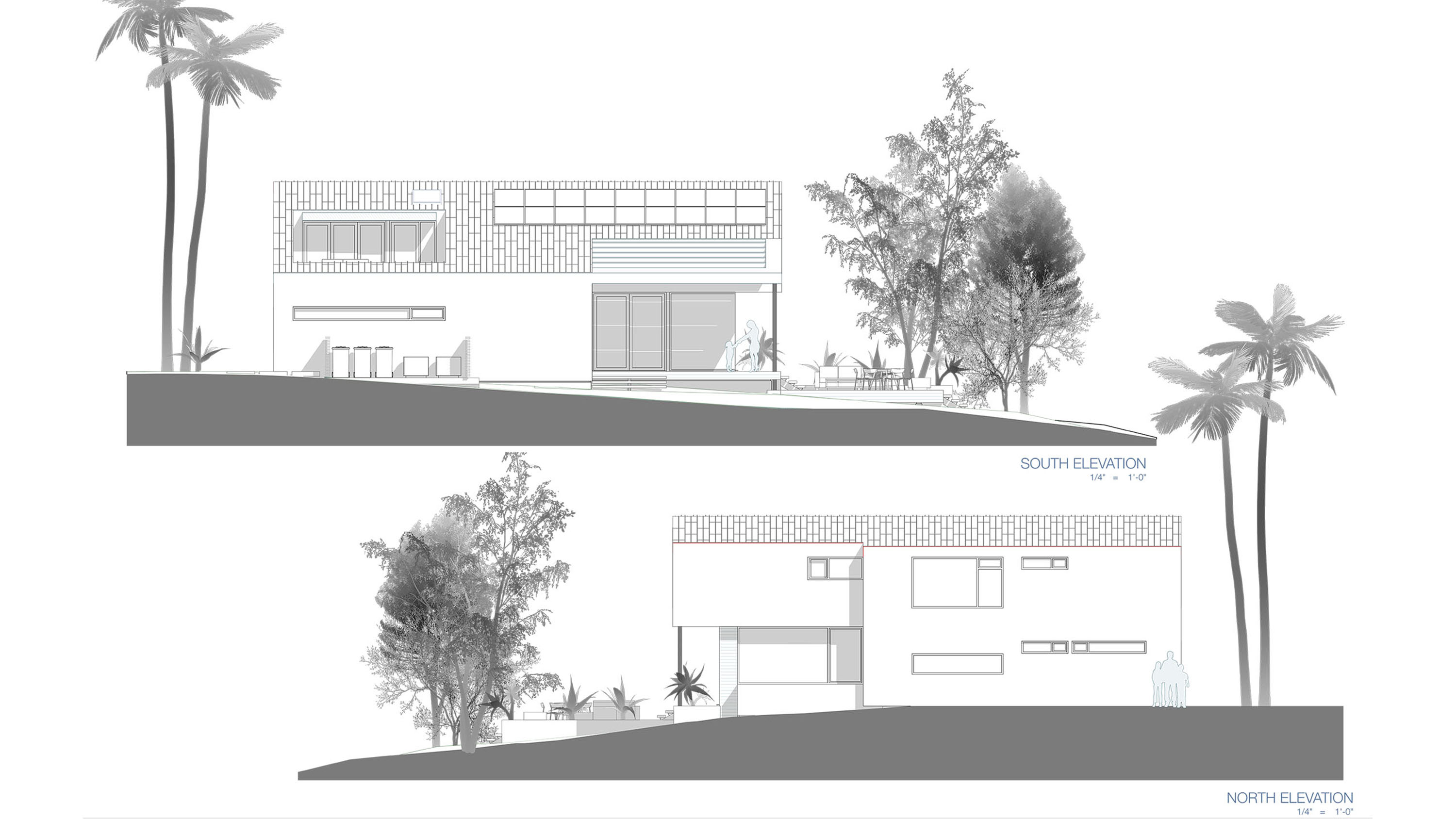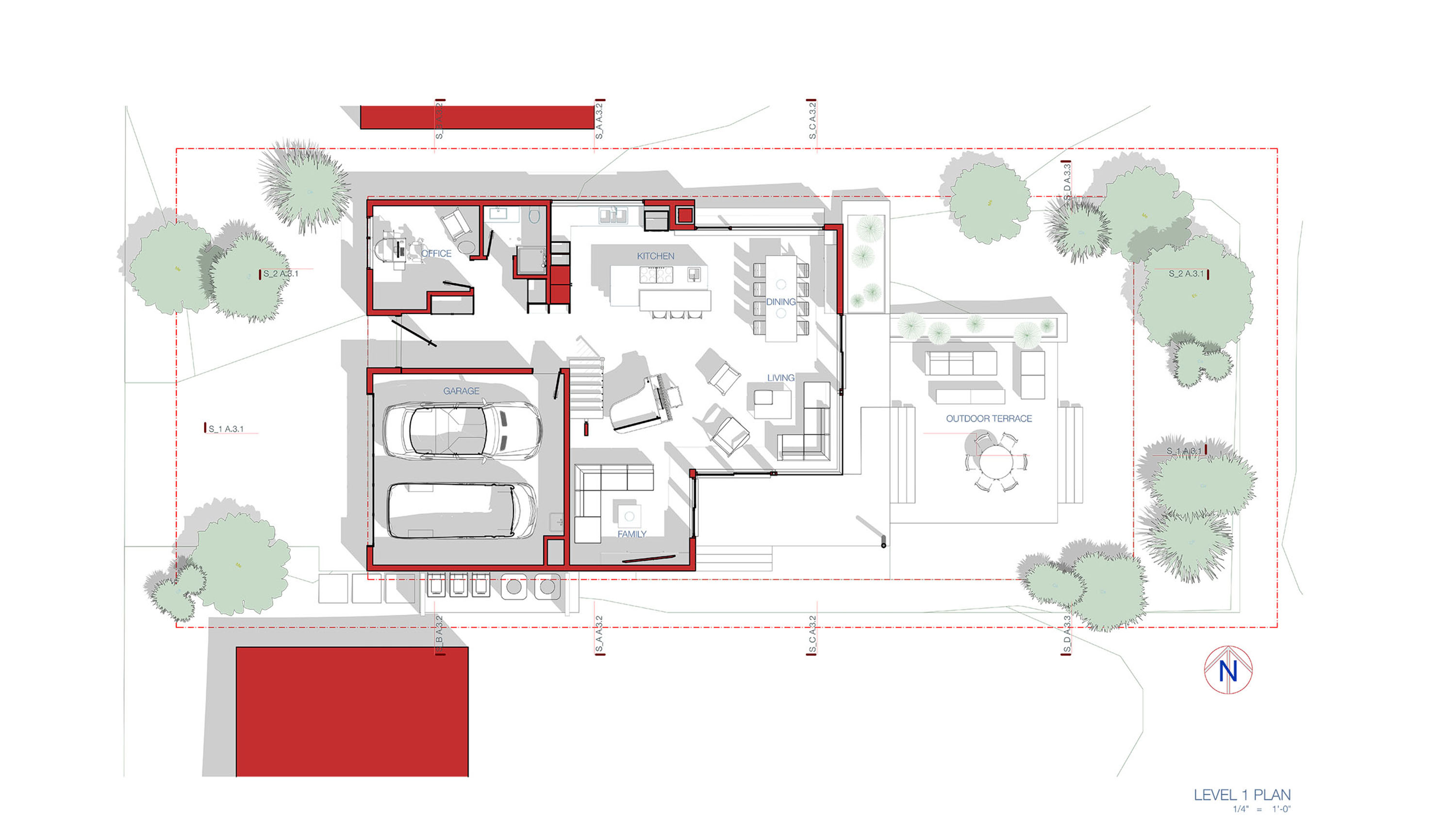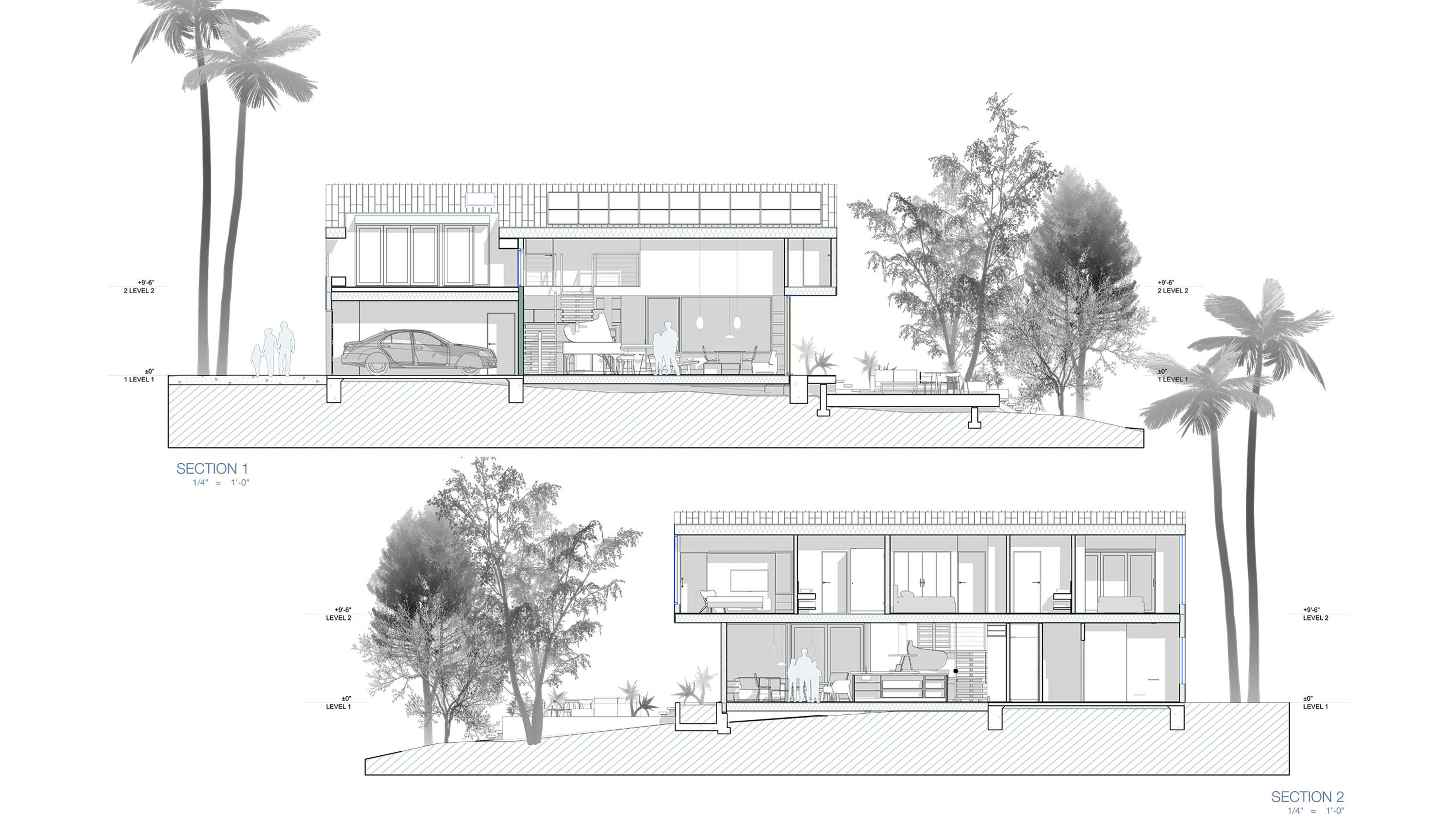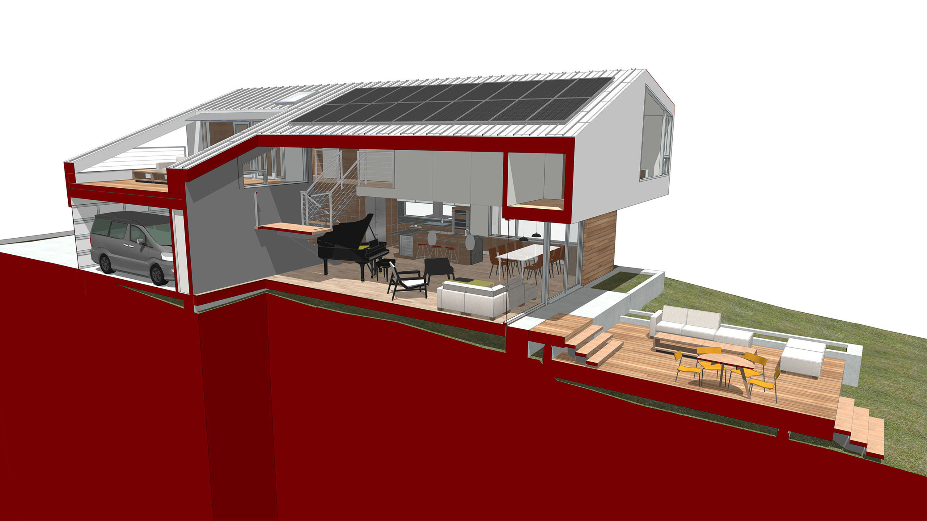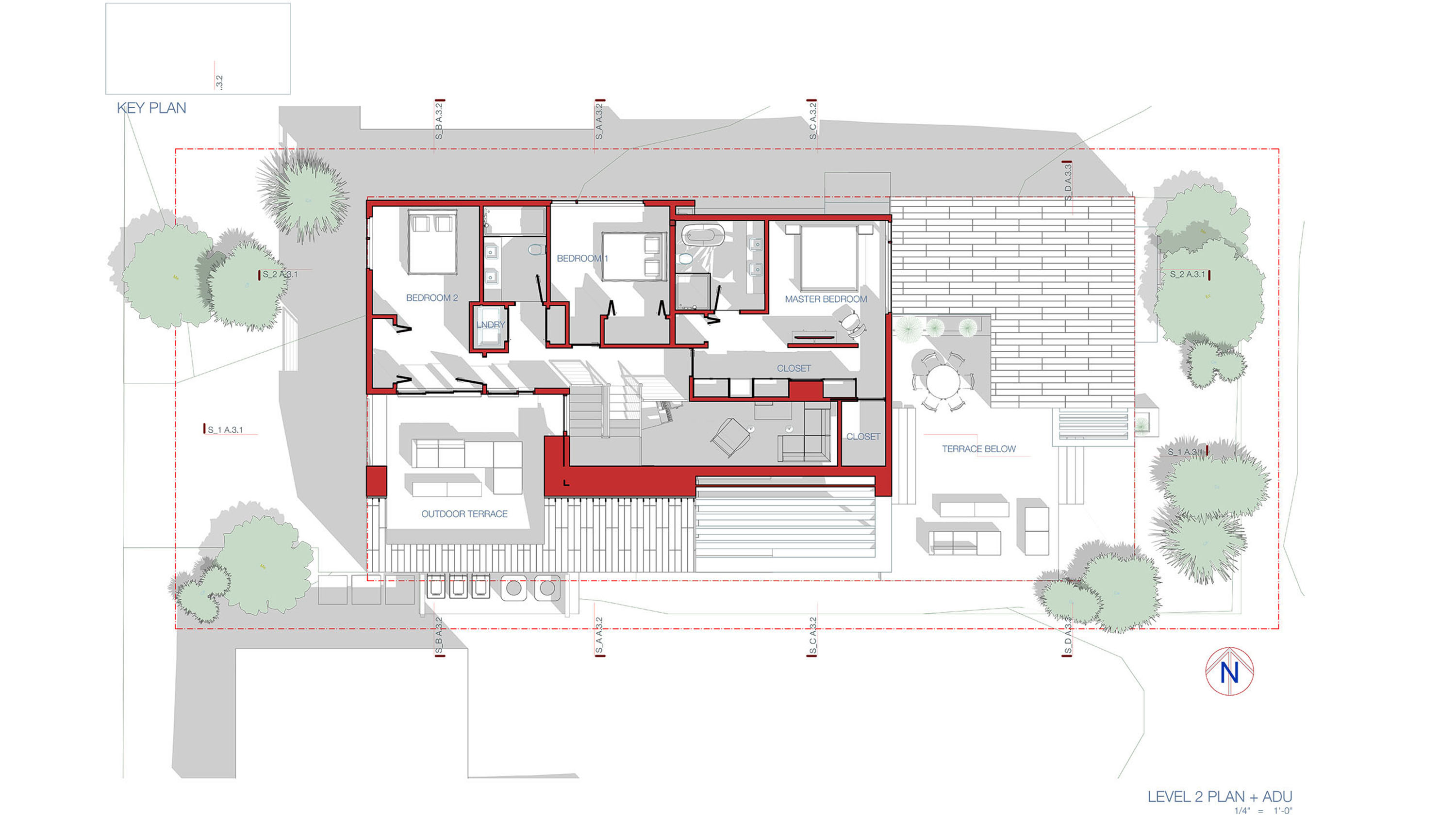 Amidst the urban setting, a tranquil garden offers a serene escape, connecting the home to nature. The rooftop deck over the garage provides panoramic views and a unique outdoor space for relaxation and entertainment. An optional ADU, part of another permit, adds to the home’s versatility and addresses California’s call for diversity and extended city planning needs. The small unit, fully autonomous, could be used as a rental or a guest suite.