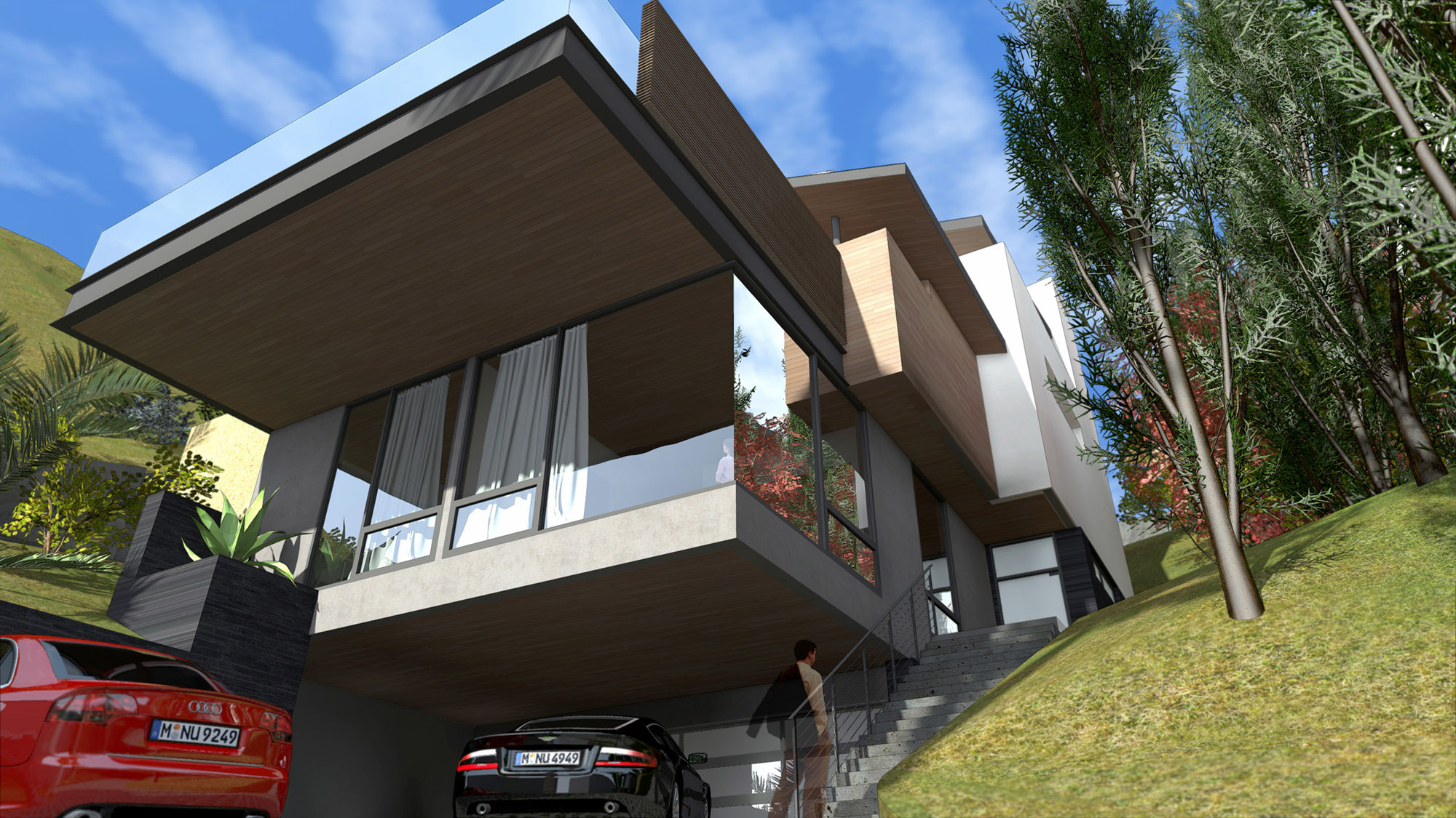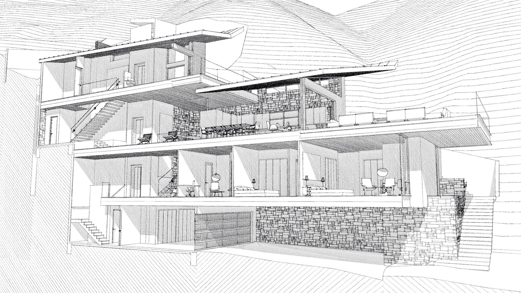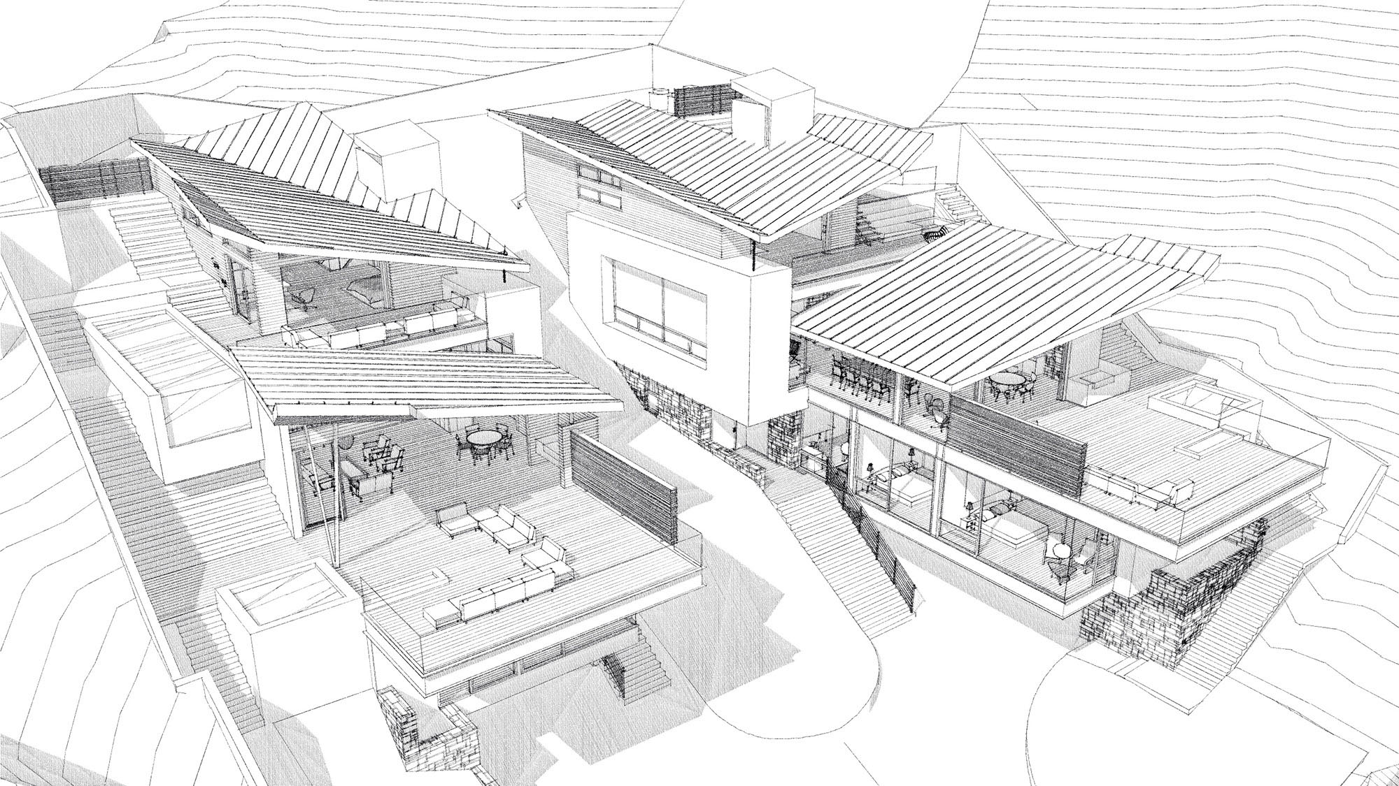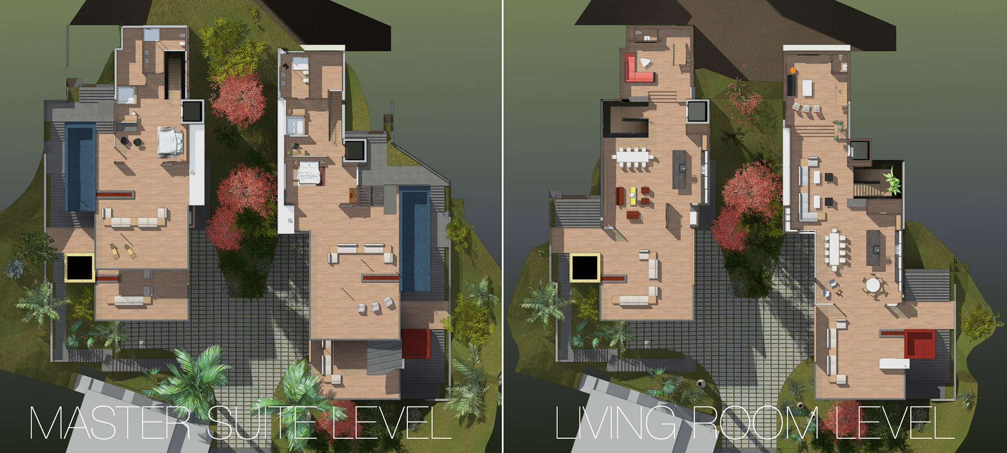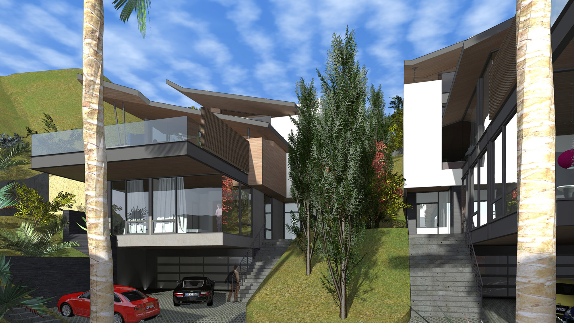 Designed with the signature ‘livable minimalism’ approach of our office, they are inspired by iconic modern homes such as Falling Water and Casa Malaparte. Nevertheless, they reside in the 21st Century as form and function and - fun, of course, as well as current building standards. The location of the homes on the property is dictated by a multitude of factors such the natural site conditions, exiting easement approach, Fire Department hydrant entry distance, allowable driveway slope, envelope height and BHO FAR, allowable cut, required toe of slope clearance and additional specifics. The spatial composition provides an airy ambience and clear, easy functional connections, starting with an ample driveway court with grass paved surface. Each home has a three car garage and additional up to five parking spots for guest parking, a hot commodity in the Hills. Service level storage rooms and wine cellars for both homes and a sauna for Home A. Interior stairs and an elevator handle vertical communication, while guests enter via spacious exterior stairs at second level.Both homes feature interior gardens around their floating staircases lit by ample skylights; seating and entry closets are convenient part of the entry. Home A features three large bedrooms, two bathrooms and a maid’s room with a full bath, while Home B has the bedroom/bathroom count and a service lounge. Laundry rooms are conveniently located at the same level.