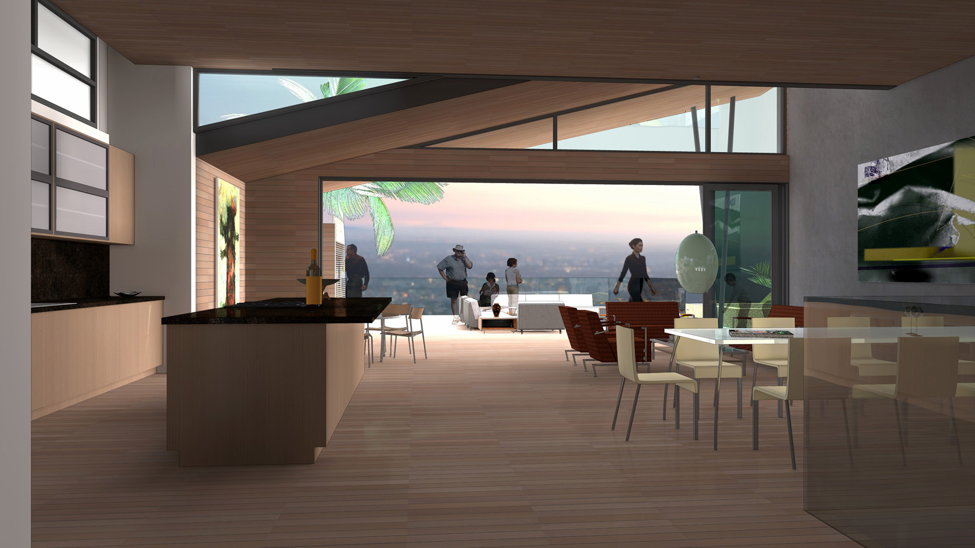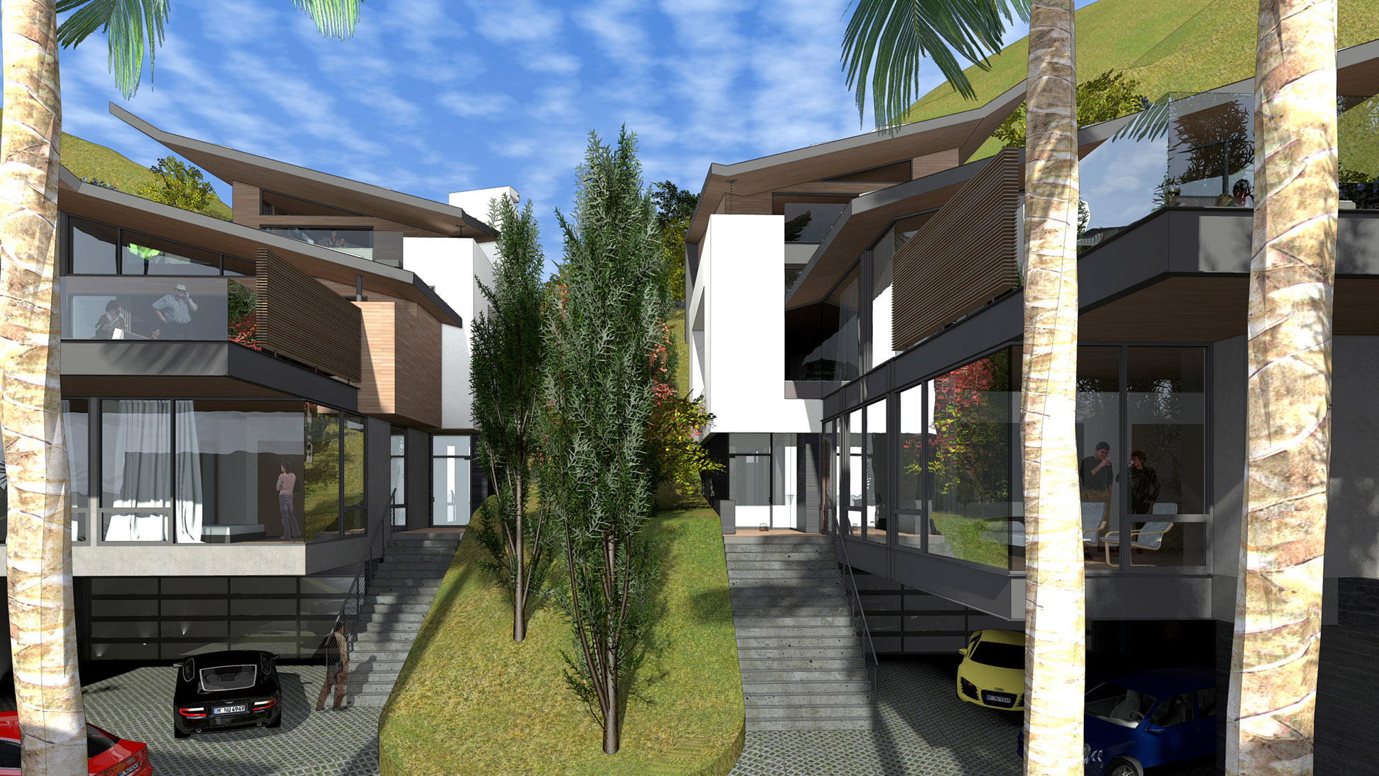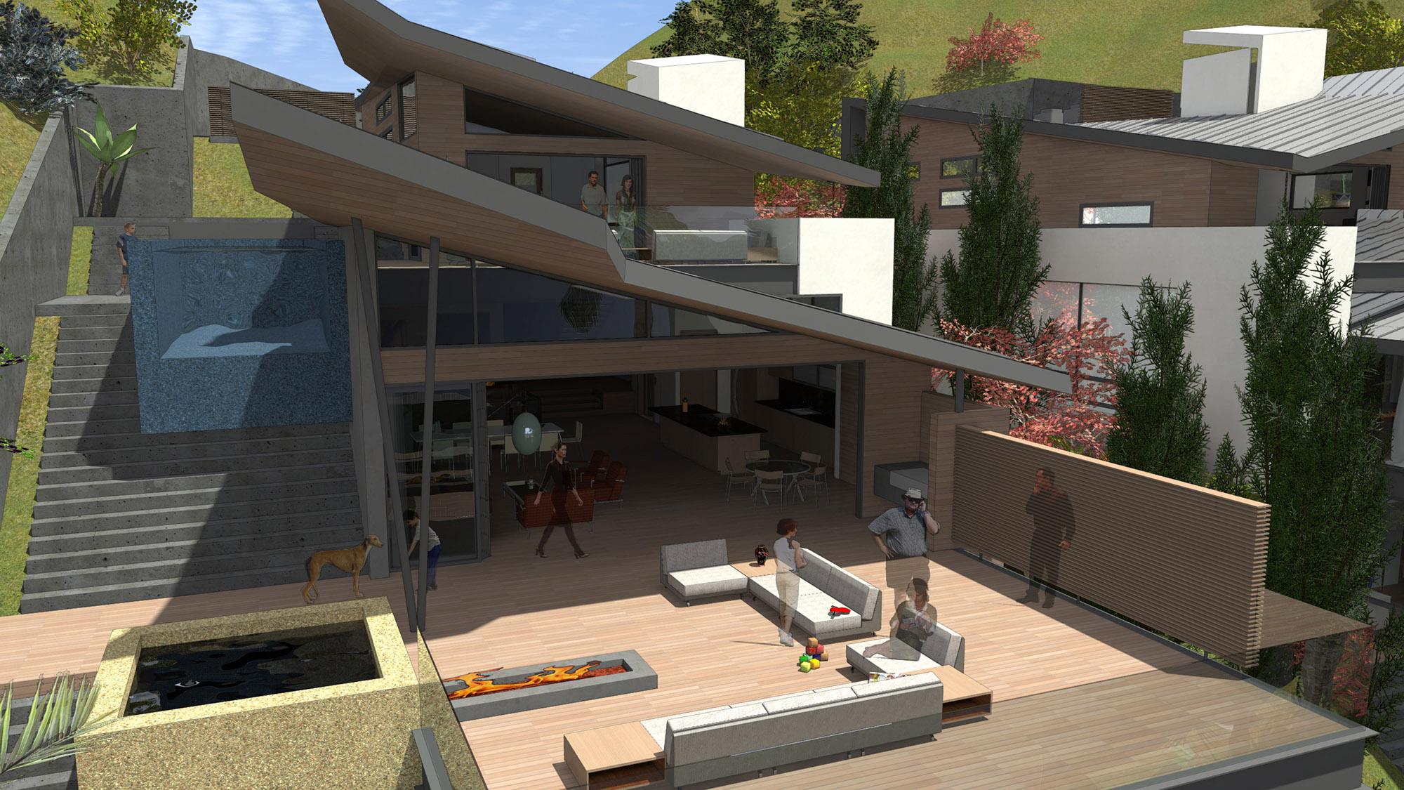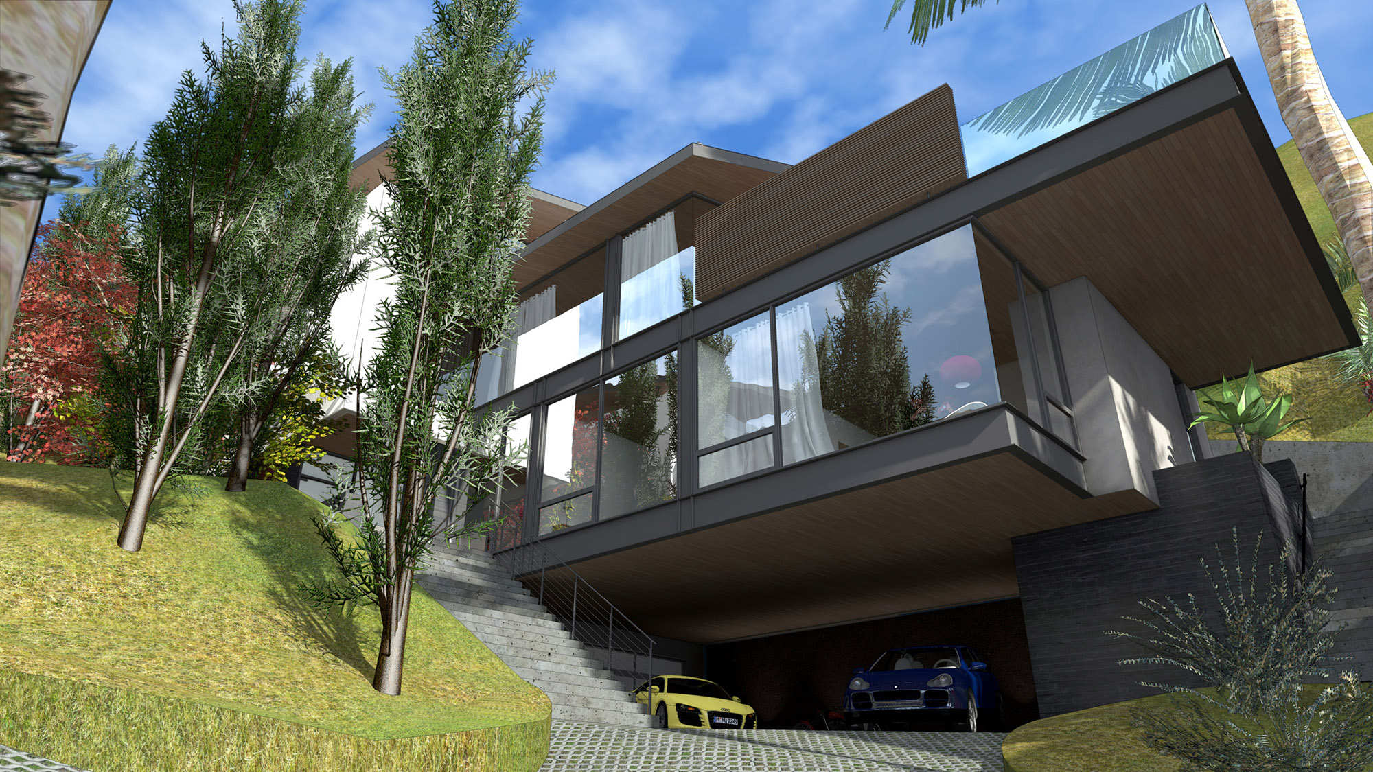 Designed with the signature ‘livable minimalism’ approach of our office, they are inspired by iconic modern homes such as Falling Water and Casa Malaparte. Nevertheless, they reside in the 21st Century as form and function and - fun, of course, as well as current building standards. The location of the homes on the property is dictated by a multitude of factors such the natural site conditions, exiting easement approach, Fire Department hydrant entry distance, allowable driveway slope, envelope height and BHO FAR, allowable cut, required toe of slope clearance and additional specifics. The spatial composition provides an airy ambience and clear, easy functional connections, starting with an ample driveway court with grass paved surface. Each home has a three car garage and additional up to five parking spots for guest parking, a hot commodity in the Hills. Service level storage rooms and wine cellars for both homes and a sauna for Home A. Interior stairs and an elevator handle vertical communication, while guests enter via spacious exterior stairs at second level.Both homes feature interior gardens around their floating staircases lit by ample skylights; seating and entry closets are convenient part of the entry. Home A features three large bedrooms, two bathrooms and a maid’s room with a full bath, while Home B has the bedroom/bathroom count and a service lounge. Laundry rooms are conveniently located at the same level.