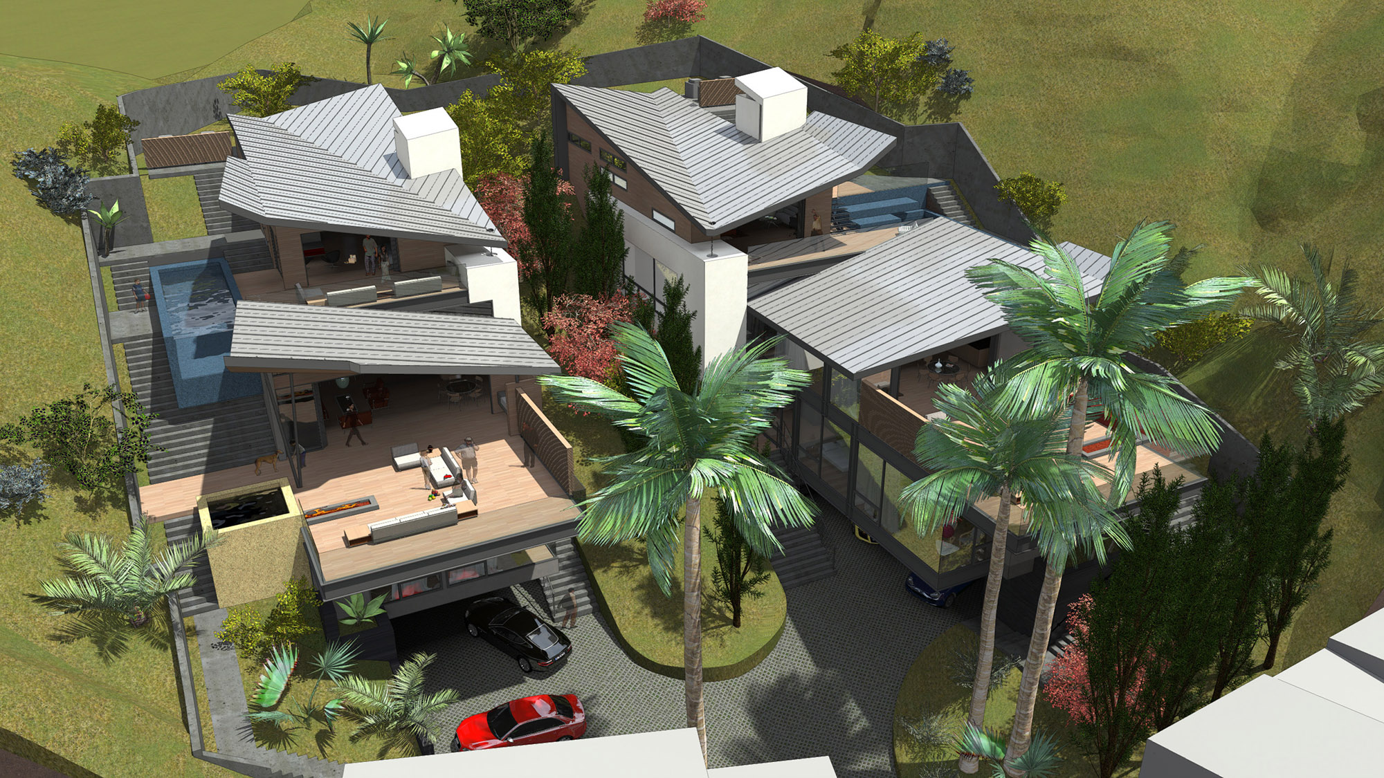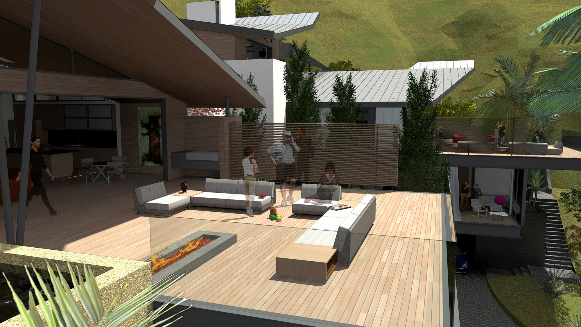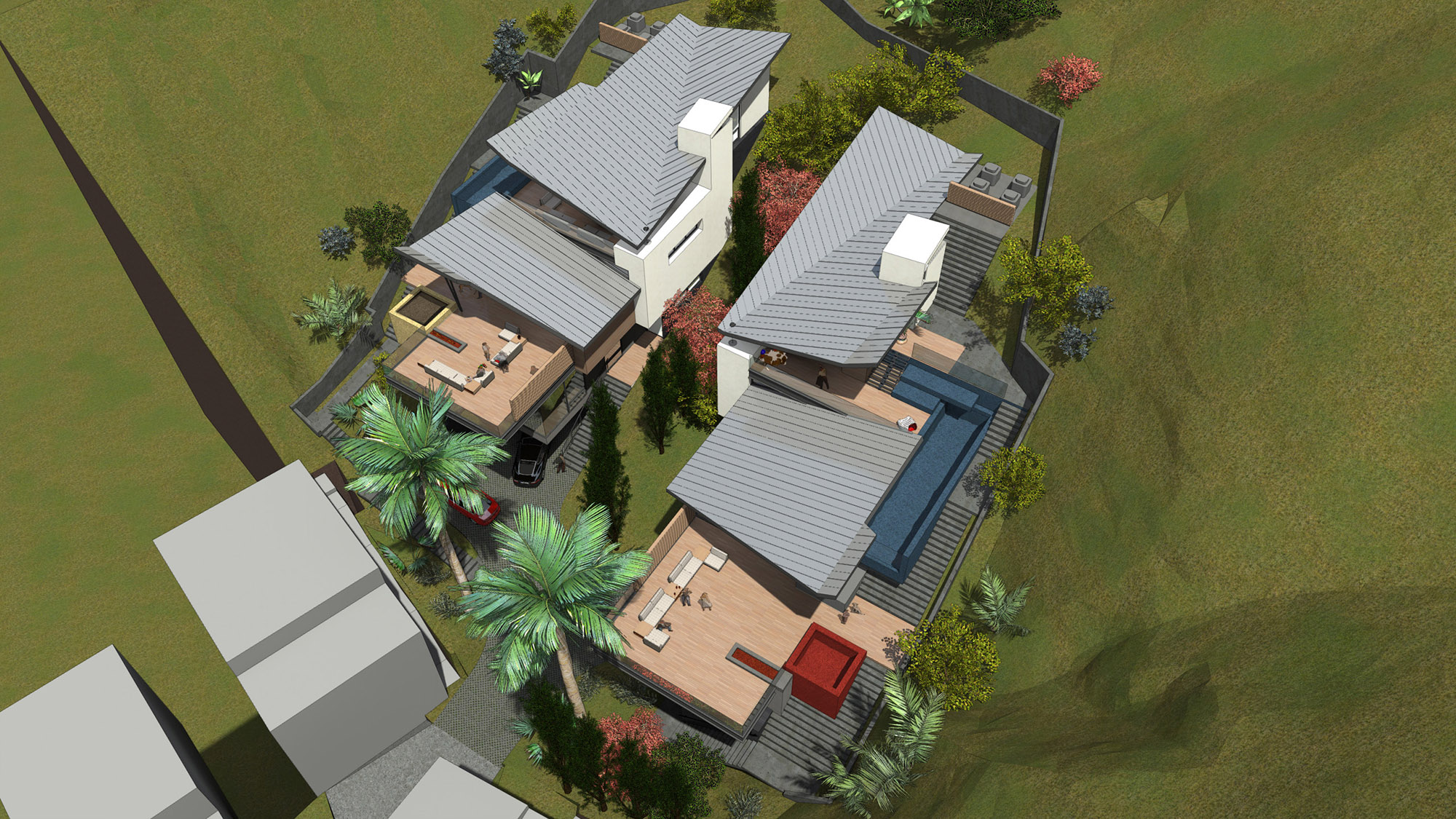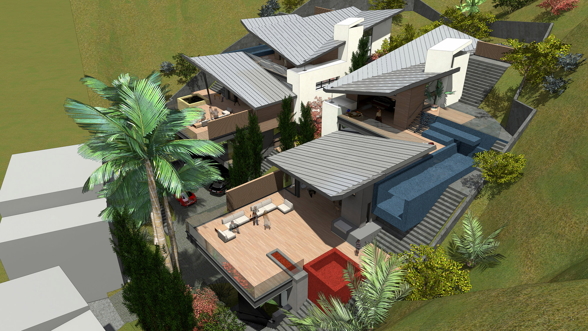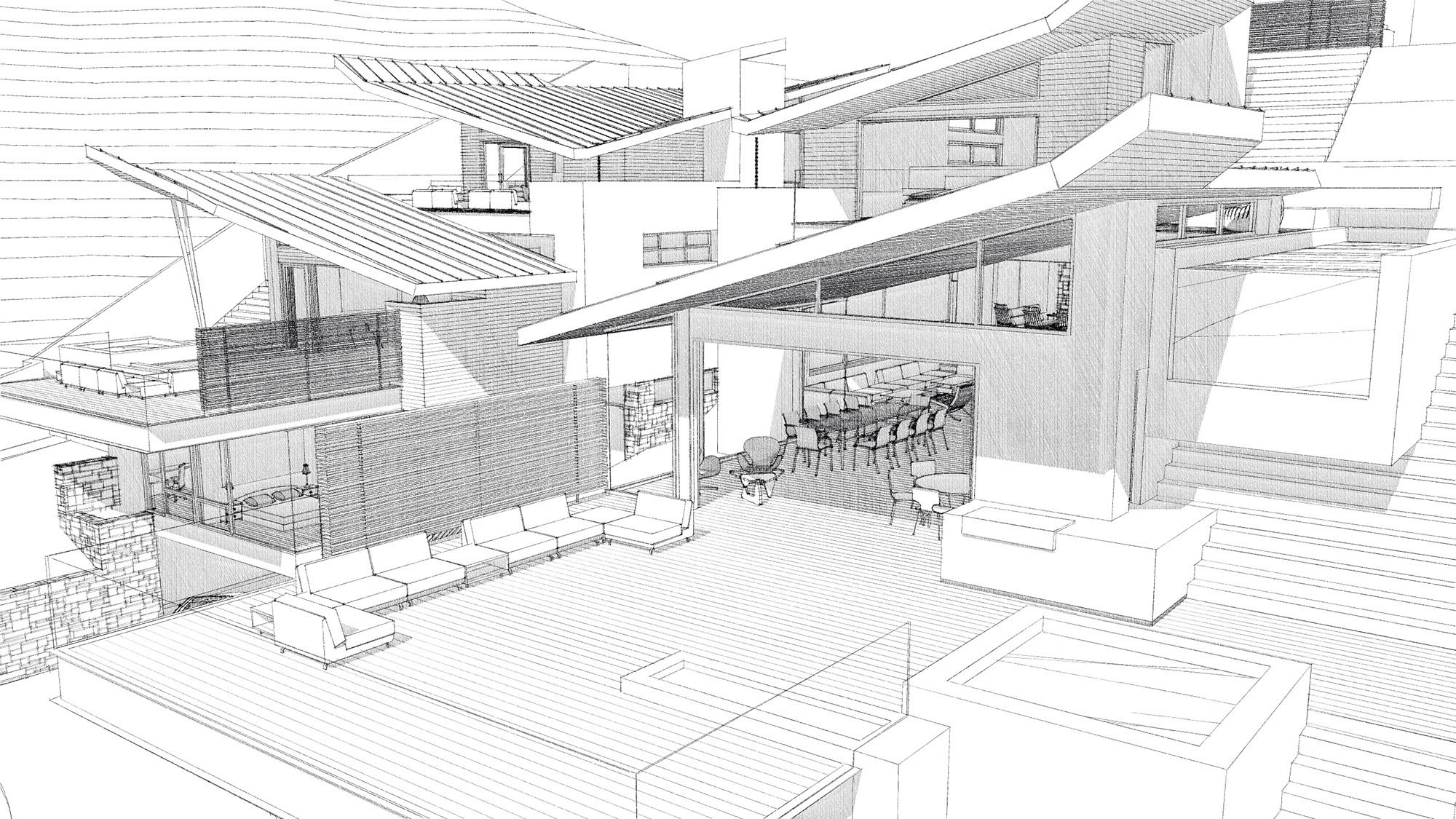 Designed with the signature ‘livable minimalism’ approach of our office, they are inspired by iconic modern homes such as Falling Water and Casa Malaparte. Nevertheless, they reside in the 21st Century as form and function and - fun, of course, as well as current building standards. The location of the homes on the property is dictated by a multitude of factors such the natural site conditions, exiting easement approach, Fire Department hydrant entry distance, allowable driveway slope, envelope height and BHO FAR, allowable cut, required toe of slope clearance and additional specifics. The spatial composition provides an airy ambience and clear, easy functional connections, starting with an ample driveway court with grass paved surface. Each home has a three car garage and additional up to five parking spots for guest parking, a hot commodity in the Hills. Service level storage rooms and wine cellars for both homes and a sauna for Home A. Interior stairs and an elevator handle vertical communication, while guests enter via spacious exterior stairs at second level.Both homes feature interior gardens around their floating staircases lit by ample skylights; seating and entry closets are convenient part of the entry. Home A features three large bedrooms, two bathrooms and a maid’s room with a full bath, while Home B has the bedroom/bathroom count and a service lounge. Laundry rooms are conveniently located at the same level.