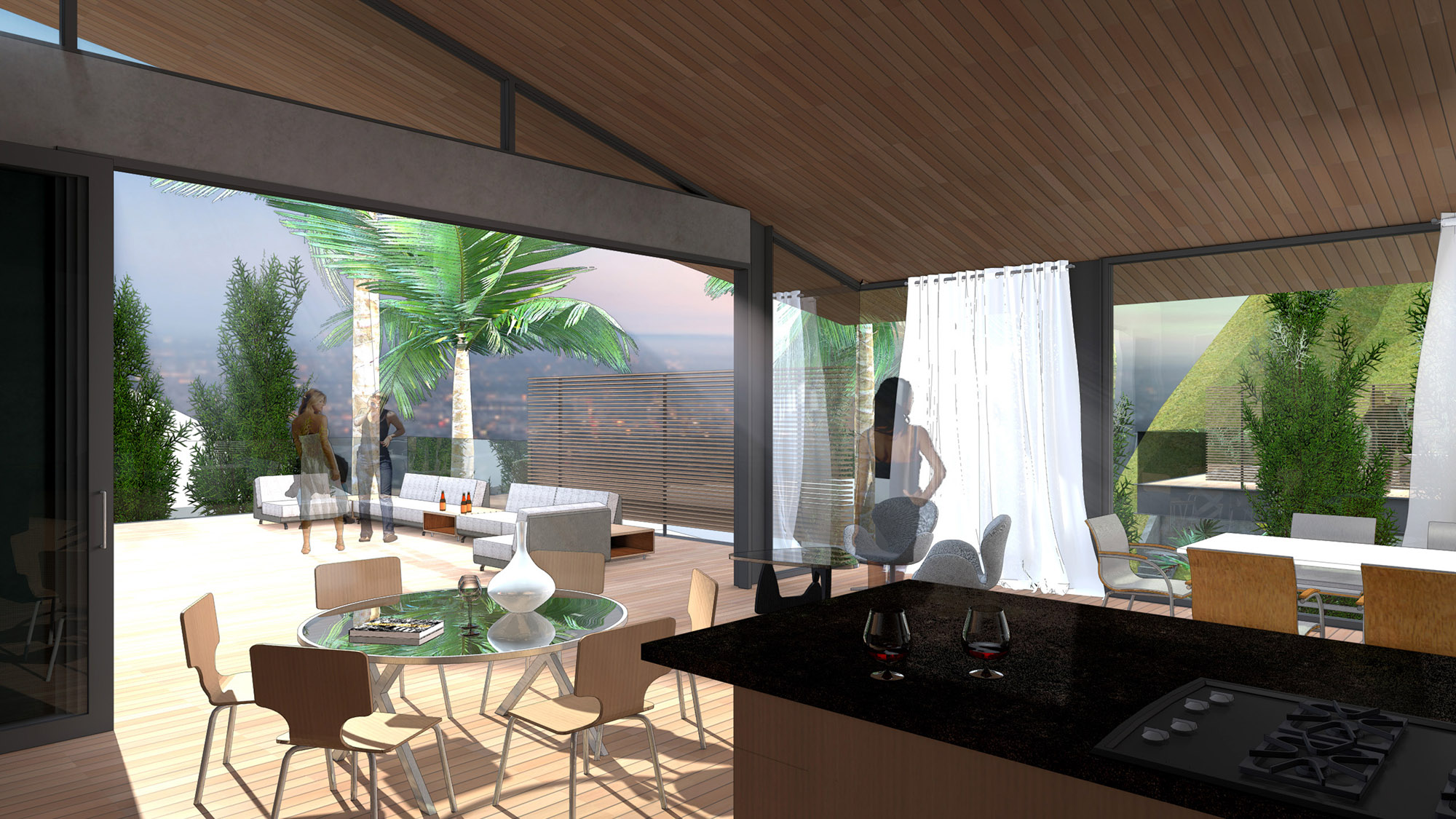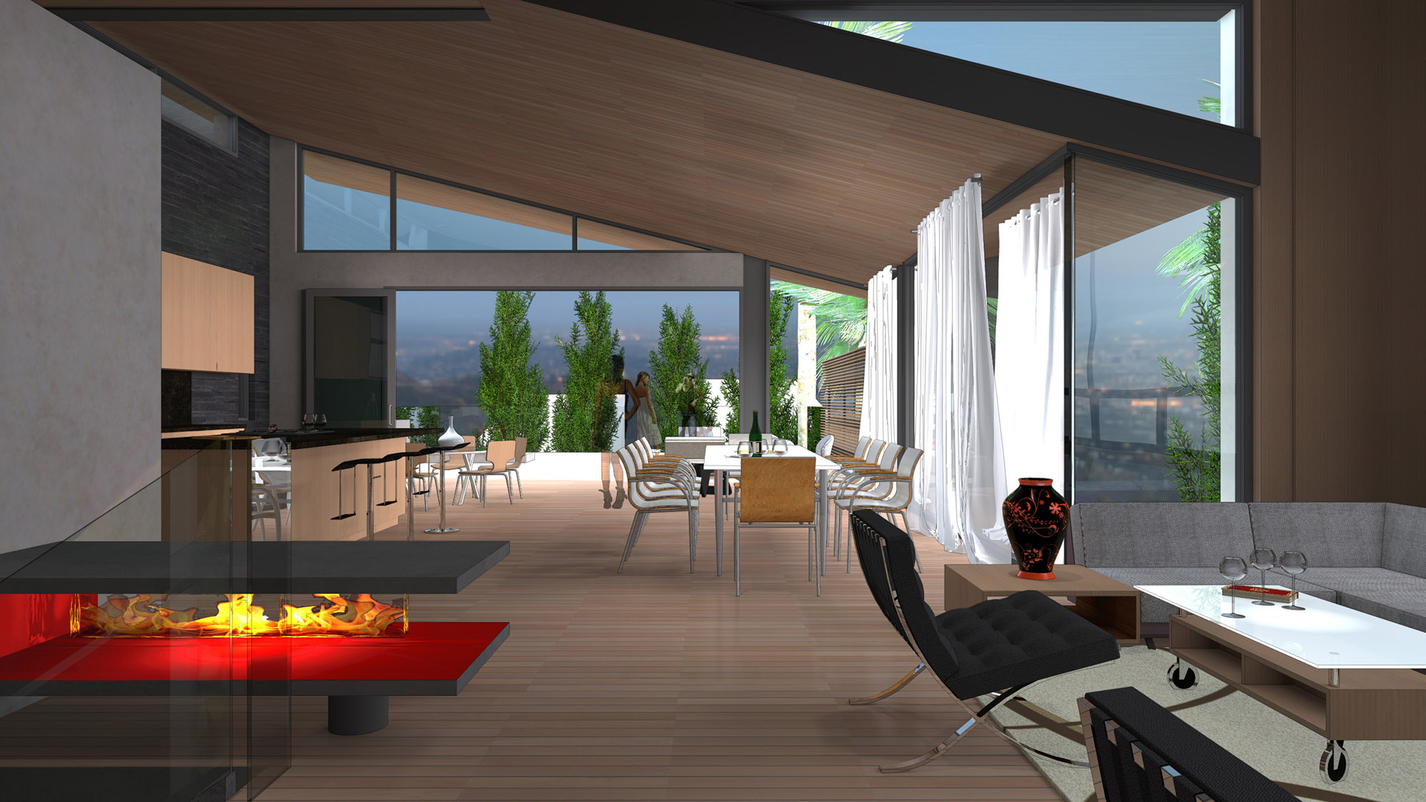 The spacious layout continues on the third floor, where the gently split level living | family room continues throughout the dining room and kitchen tract to a large outdoor terrace with a BBQ, exterior fire pit and hot tub as well as plenty of seating. Fully retractable glass doors take away the division of in and outdoors. In turn, the interior fire pits are visible from all corners of the space. The terraces are shielded by the sizable overhangs of the master suite decks above and the wooden privacy screens in between the two homes. Dense floral elements between the buildings provides a second layer of privacy. The master suite is at the top level and features another sizable outdoor terrace with fabric shades, coordinating color identity for each house. This is also emphasized by the elongated lap pools at that level with an infinity swim through clear glass wall to the South. Both master suites have large indoor hot tubs and separate bathrooms with WC and bidet, ample closet space, interior fire pits, additional seating and desk areas, as well as a dedicated makeup armoire. More builtin storage indoors and out on the terrace is provided in both homes, while large skylights cast light into the indoor gardens below. Overall, both homes make the best out of a very complex setting and envelope by creating an unique modern, yet warm and gracious environment with highly sustainable features, full indoor-outdoor integration, 21st century home automation and entertainment facilities.